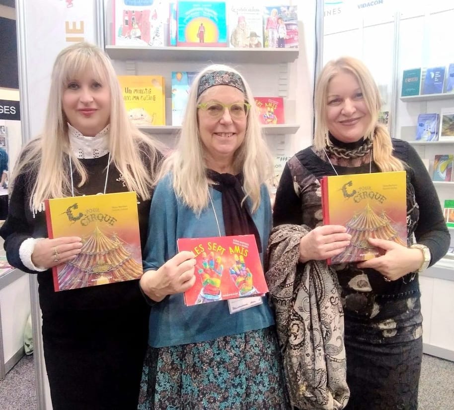 En compagnie de Marie Cadieux (directrice des publications) au centre et de Daniela Zekina (illustratrice) à droite.